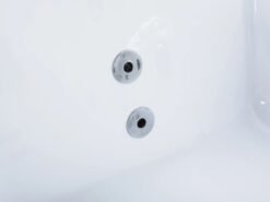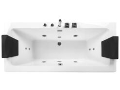 Esta bañera, de líneas limpias y diseño rectangular, encaja perfectamente en cualquier baño contemporáneo. Ofrece un equilibrio ideal entre estética y confort. Diseñada para dos personas, incluye reposacabezas de polipiel a cada lado y grifería central, lo que permite disfrutar de un baño relajante en pareja.