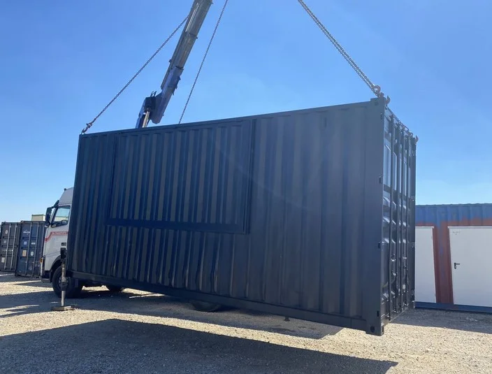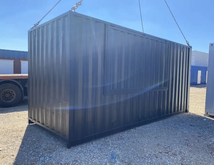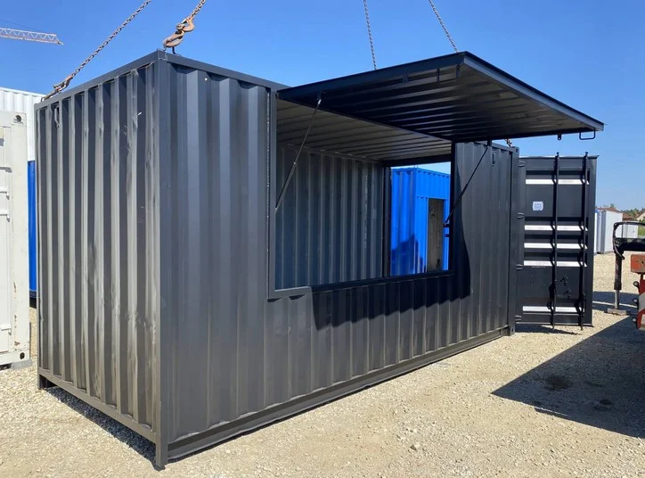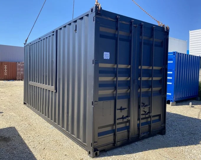 Una ventana está ubicada en la pared larga del contenedor, lo que proporciona una excelente visibilidad e iluminación natural en el interior.