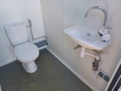 El módulo está dividido en dos cabinas independientes, cada una con su propia puerta en una de las paredes largas, garantizando privacidad para los usuarios. Su tamaño facilita el transporte y la instalación, lo que lo convierte en una opción práctica y rápida para cualquier necesidad de baño móvil.