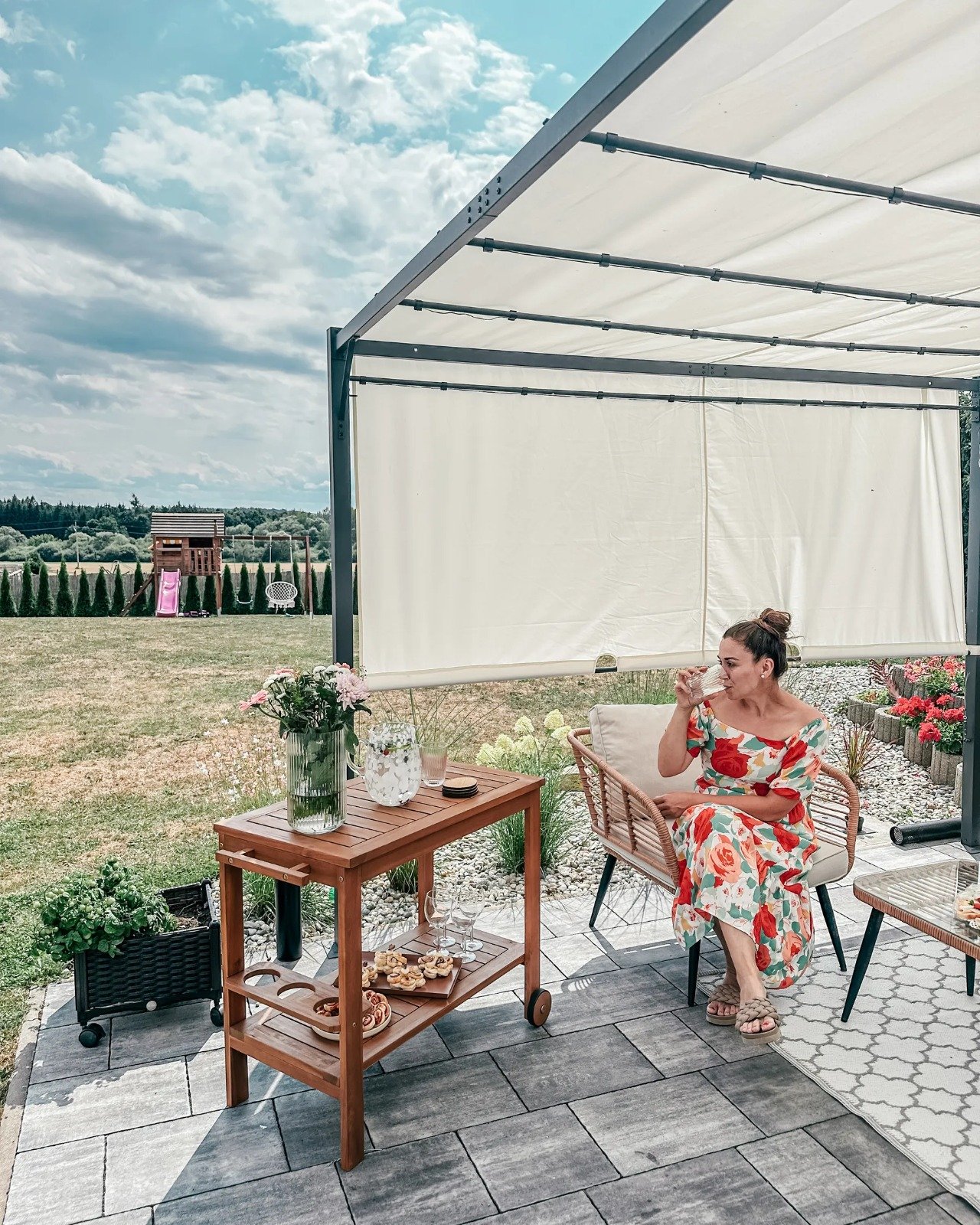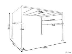 Su sólida estructura de acero termolacado garantiza una excelente estabilidad. El toldo corredero es resistente a los rayos UV (UPF 30+) y se puede mover fácilmente para ajustar la sombra a tu gusto.