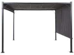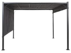 Su sólida estructura de acero termolacado garantiza una excelente estabilidad. El toldo corredero es resistente a los rayos UV (UPF 30+) y se puede mover fácilmente para ajustar la sombra a tu gusto.
