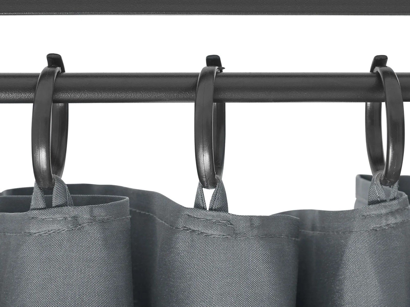 Gran tamaño para conjuntos de comedor o lounge, protegiéndote del sol con su toldo y 6 cortinas con cremalleras prácticas. Estructura robusta de acero con recubrimiento en polvo en negro, combinada con tela de poliéster gris grafito fácil de cuidar. Ofrece protección UV UPF 30+. Se instala fácilmente sin cimientos.