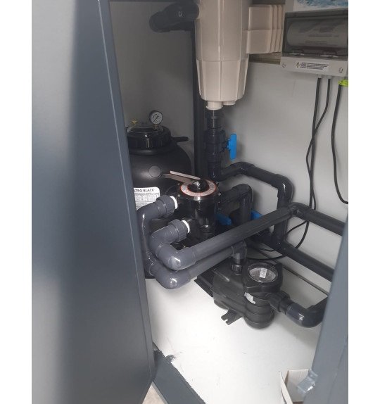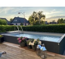 Contenedor de piscina transportable SIN LICENCIA 5M25x2M55x1M26, dimensiones interiores 4M15 x 2M25 (versión elevada). Peso de la piscina vacía: 1150 Kg Piscina sin instalación, equipada con sistema de filtración (1 skimmer, 2 boquillas de impulsión y desagüe, 1 proyector LED blanco con su mando a distancia, 1 filtro de arena Ø 400 mm – 6,5 m³). /h ofreciendo una finura de filtración de 40 a 50 micras con válvula de 6 vías (arena incluida), motobomba de 0,5 HP, 1 cuadro eléctrico). Toda la maquinaria se ubicará en la sala técnica. En cuanto al liner, se comercializará (gris claro 75/100) y estará compuesto por una membrana de altas prestaciones, barnizada por el lado del agua, resistencia y protección contra el envejecimiento por rayos ultravioleta, contra la abrasión y el rayado, contra agentes colorantes, contra microorganismos, contra ataques y suciedad en el lado del agua.