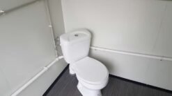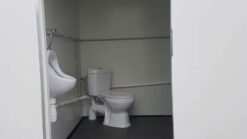 El remolque se divide en dos cabinas independientes, una para hombres y otra para mujeres. Cada zona cuenta con su propia puerta de entrada y escaleras. El equipamiento interior incluye dos inodoros, un urinario y dos lavabos, lo que garantiza un servicio higiénico y funcional para un gran número de usuarios.